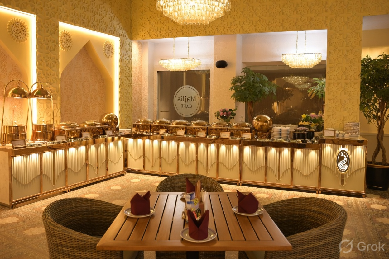 Featuring a diverse menu of Middle Eastern, Indian, and international cuisines, along with artisanal beverages and decadent desserts, Majlis Café adds a touch of culinary brilliance to your special day.